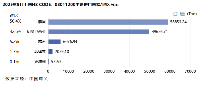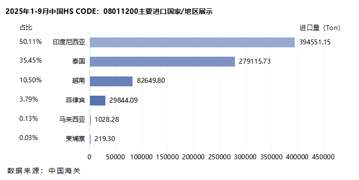 据中国海关最新数据显示,2025年1-9月椰子产品(HS code:08011200)进口量为78.74万吨,同比增长22.7%。其中,印度尼西亚的进口量最高,达到39.46万吨,同比增长46.7%;其次是泰国的进口量,达到27.91万吨,同比增长21.6%;越南的进口量排在第三位,达到8.26万吨,同比下降35.5%。