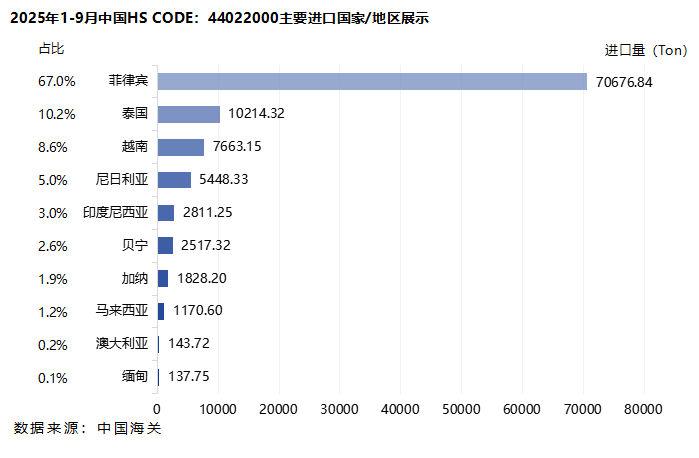 据中国海关最新数据显示,2025年1-9月果壳炭或果核炭产品(HS code:44022000)进口量为10.27万吨,同比下降16.8%。其中,菲律宾进口量最高,达到7.07万吨,同比下降22.0%;其次是泰国的进口量,达到1.02万吨,同比增长398.7%;越南的进口量排在第三位,达到7663.15吨,同比增长74.7%。