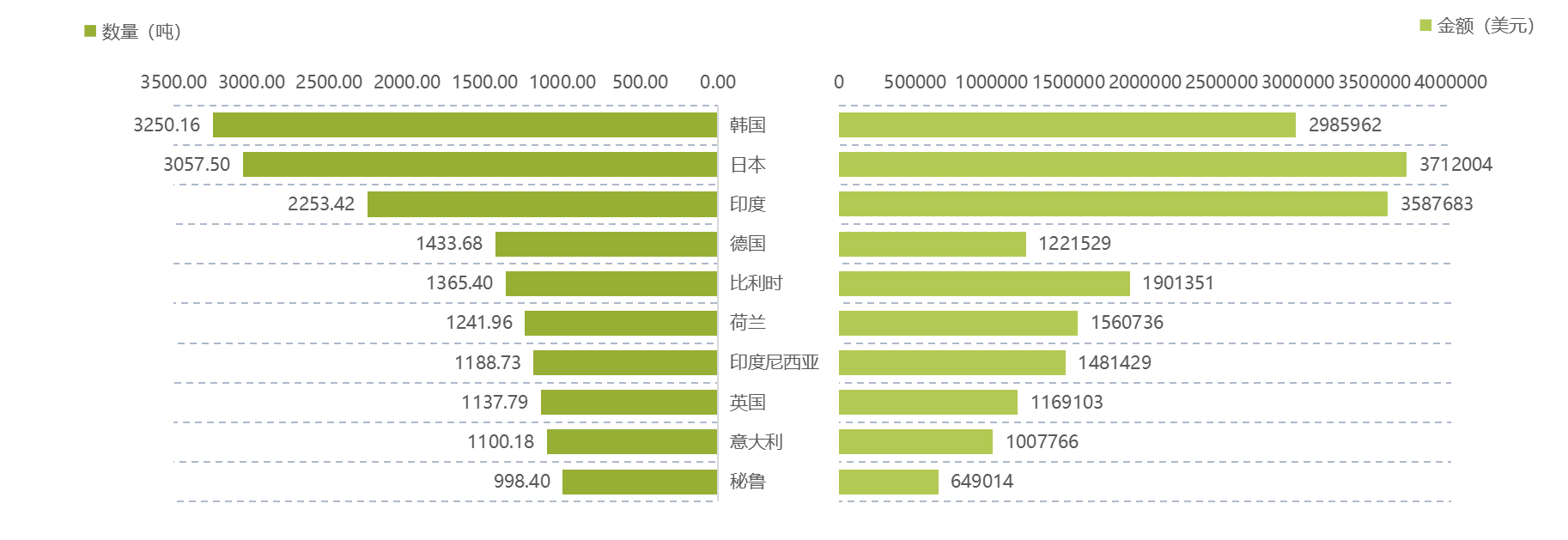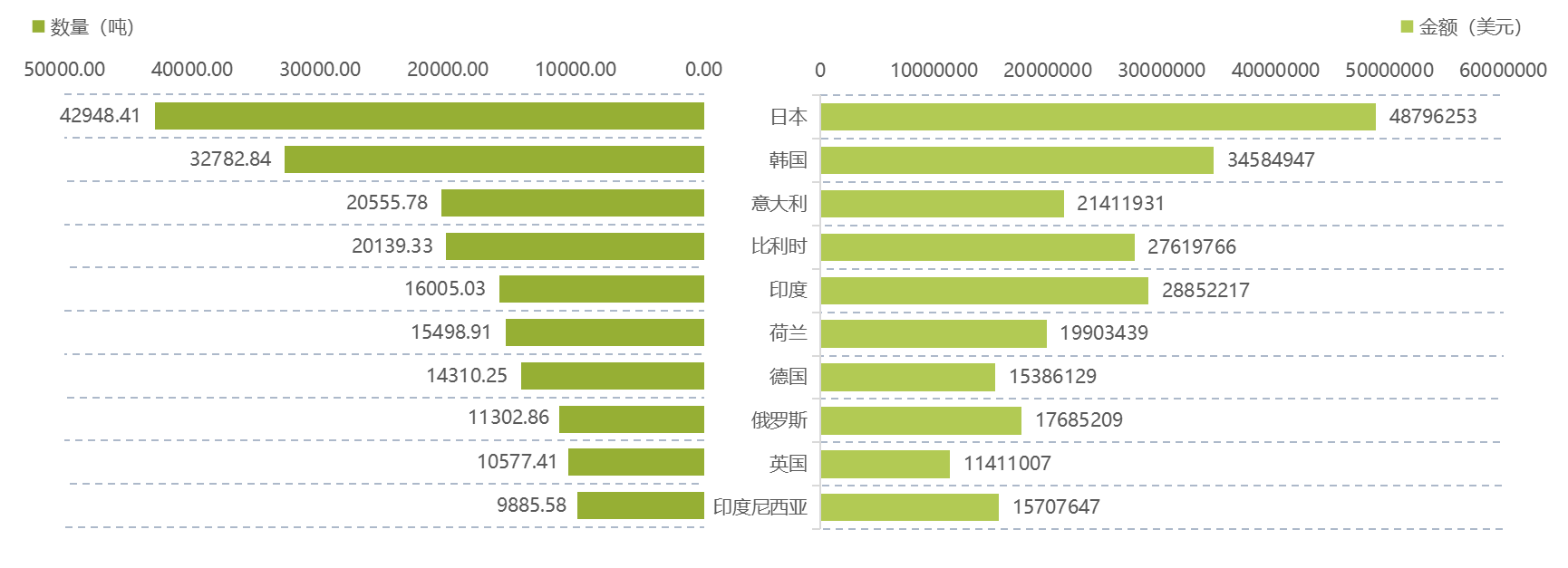 日本、韩国、意大利、比利时为主要出口市场,数量与金额均居前。印度、俄罗斯、印度尼西亚均价较高,或为高附加值产品出口地。
