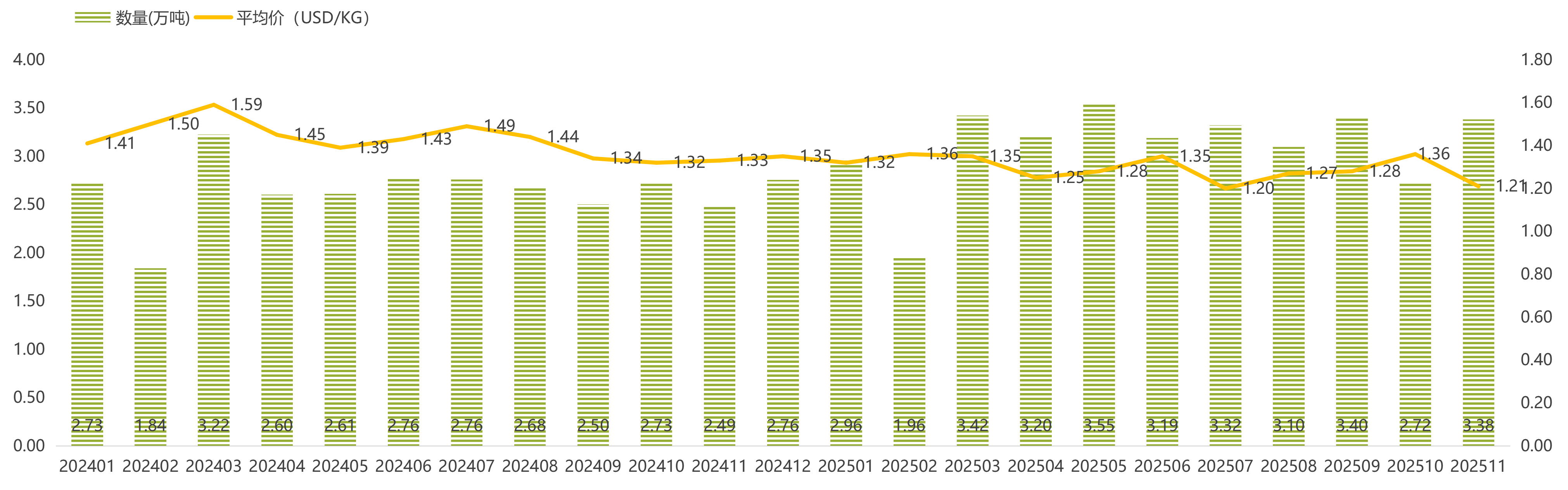 11月出口量大幅反弹24.2%,而出口额的增长幅度(10.3%)远低于数量的增长。平均单价从10月的1.36美元骤降至1.21美元,成为2025年截至目前单价第二低的月份(仅高于7月的1.20美元)。