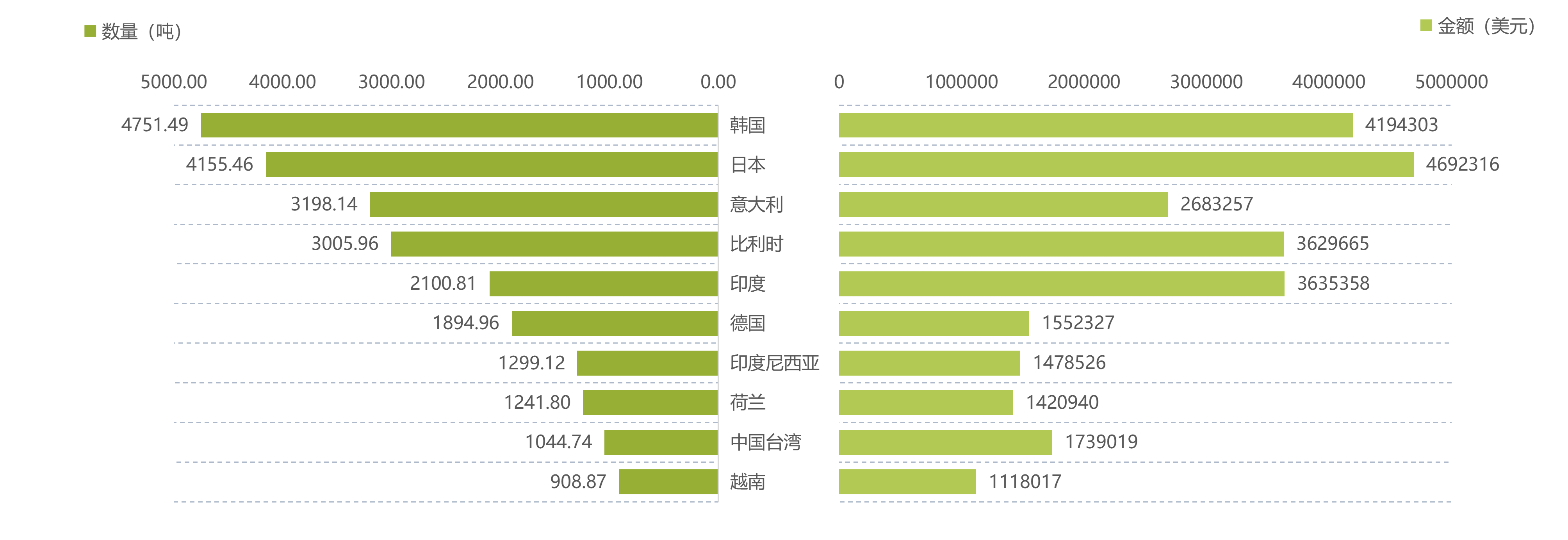 2025年11月,活性炭主要出口贸易地如图所示,出口量排名第一的为韩国,达到4751.49吨,占当月总量的14.1%,出口额为419.43万美元,排名第二的为日本,达到4155.46吨,占当月总量的12.3%,出口额为469.23万美元,排名第三的为意大利,达到3198.14吨,占当月总量的9.5%,出口额268.33万美元。