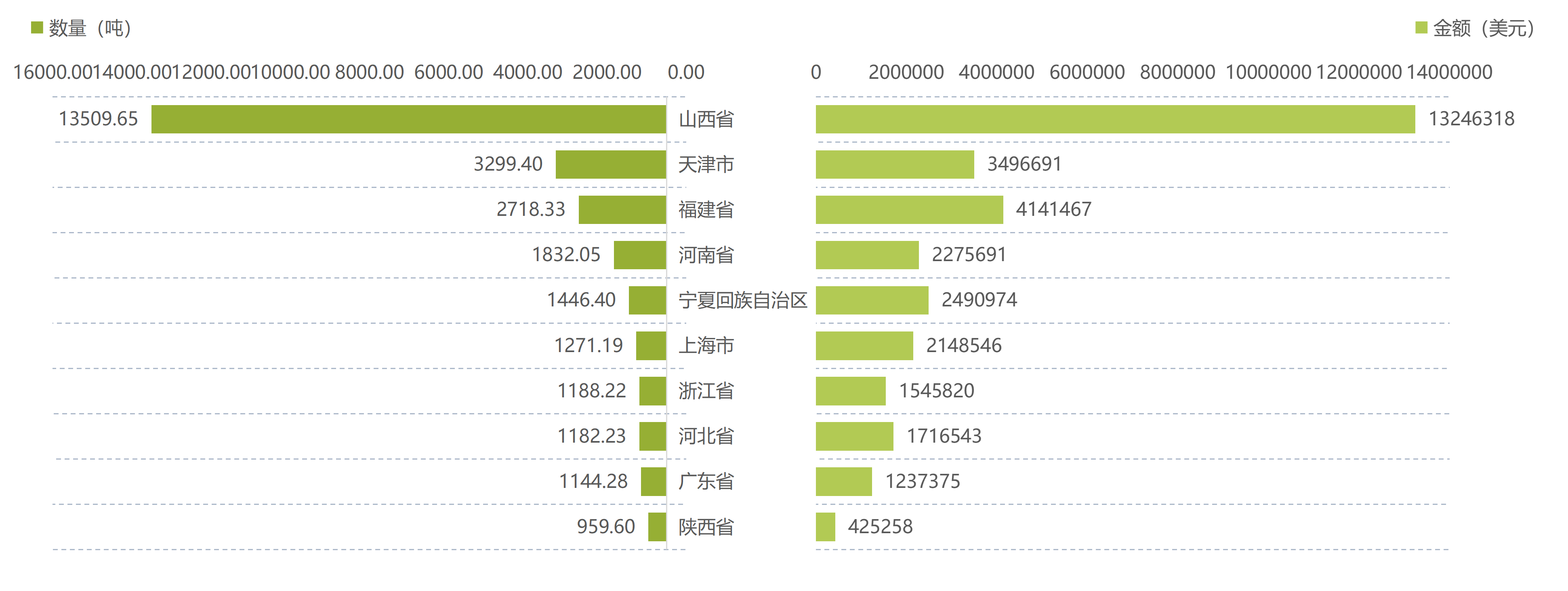 2025年11月,活性炭主要出口发货地排名如图所示,出口量排名第一的为山西省,达到1.35万吨,占当月总量的40.0%,出口额为1324.63万美元,排名第二的为天津市,达到3299.40吨,占当月总量的9.8%,出口额为349.67万美元,排名第三的为福建省,达到2718.33吨,占当月总量的8.0%,出口额414.15万美元。