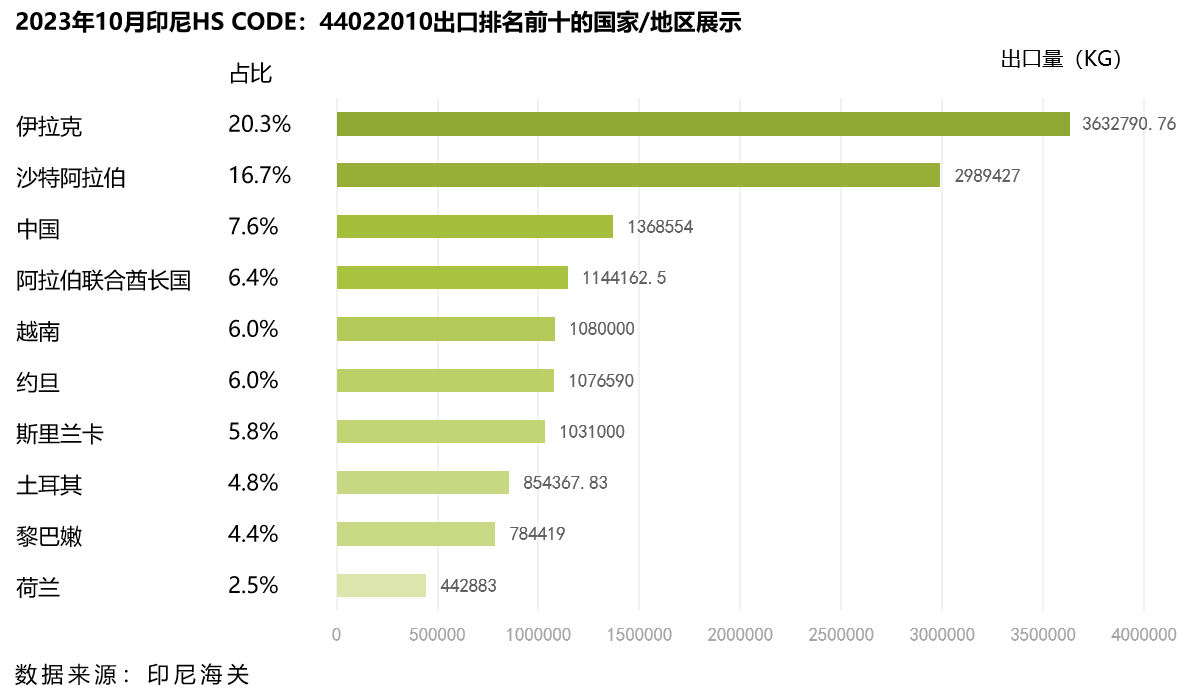 印尼海关最新数据显示,2023年10月壳炭、椰壳炭类产品(HS code:44022010)出口量为1.79万吨,同比增长28.1%,环比增长 14.7%。其中,伊拉克的出口量最高,达到3632.79吨;其次是沙特阿拉伯,出口量为2989.43吨;中国的出口量排在第三位,达到1368.55吨。