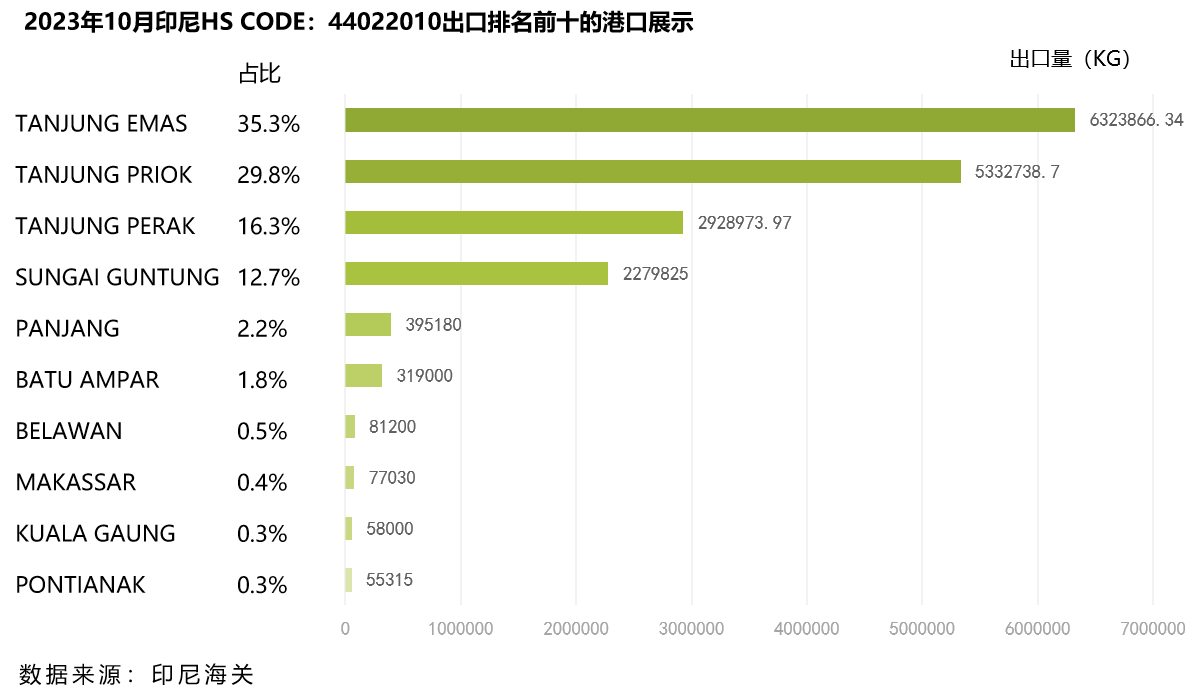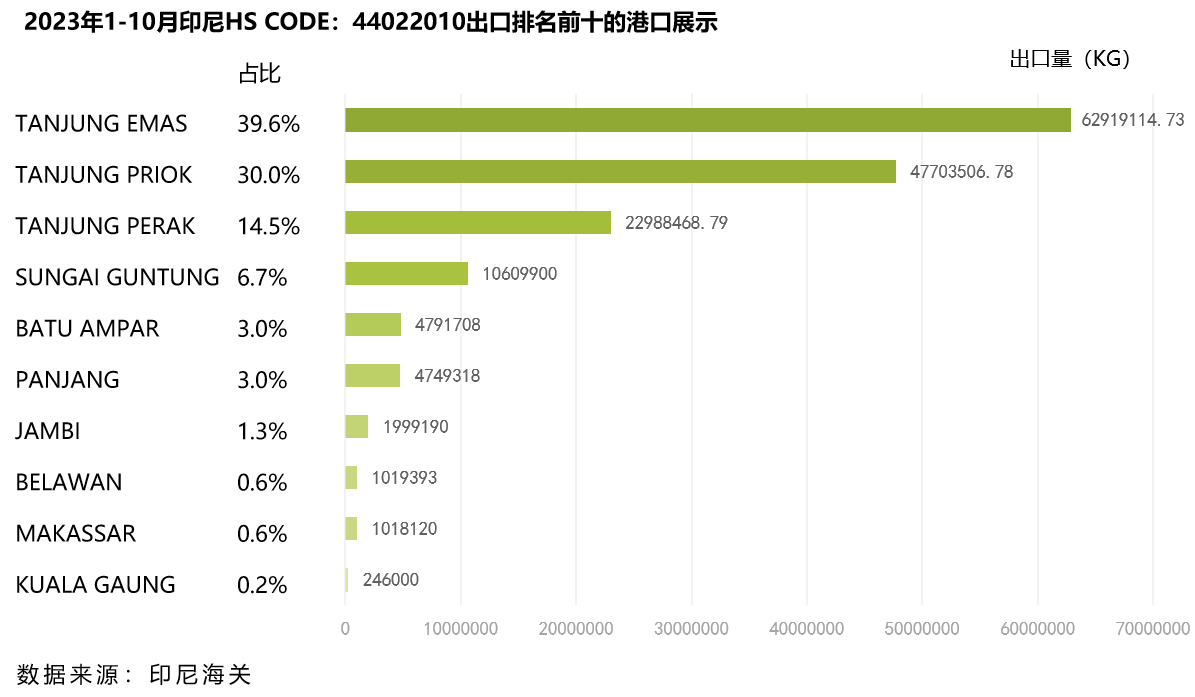 印尼海关最新数据显示,2023年1-10月竹、壳或坚果制炭(HS code:44029000)出口最多的港口是泗水港口(TANJUNG PERAK),出口量125175.3吨;其次是潘姜港口(PANJANG),出口量是52747.72 吨;第三是雅加达港口(TANJUN PRIOK),出口量是30848吨。