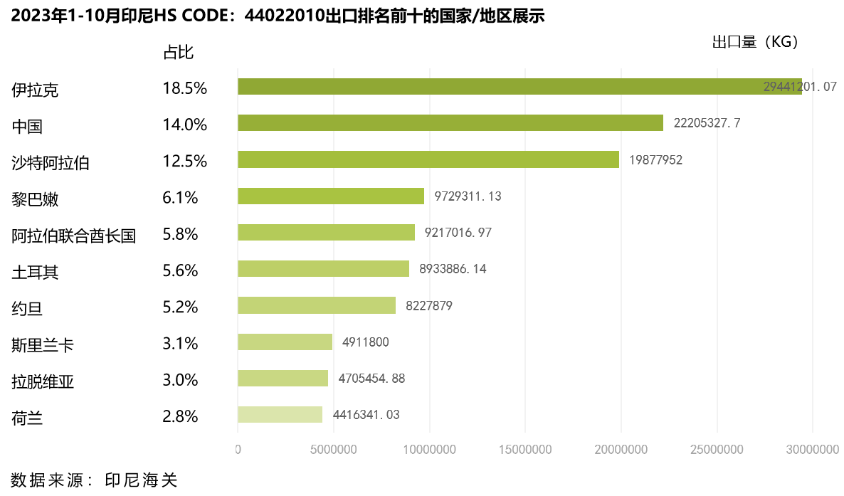 2023年1-10月,印尼壳炭、坚果炭,椰壳炭类产品(HS code:44022010)出口最多的国家是伊拉克,出口量达到 29441.2吨;到中国的出口量达到 22205.33吨,排名第二位,平均每月到中国的出口量是2220.53吨。