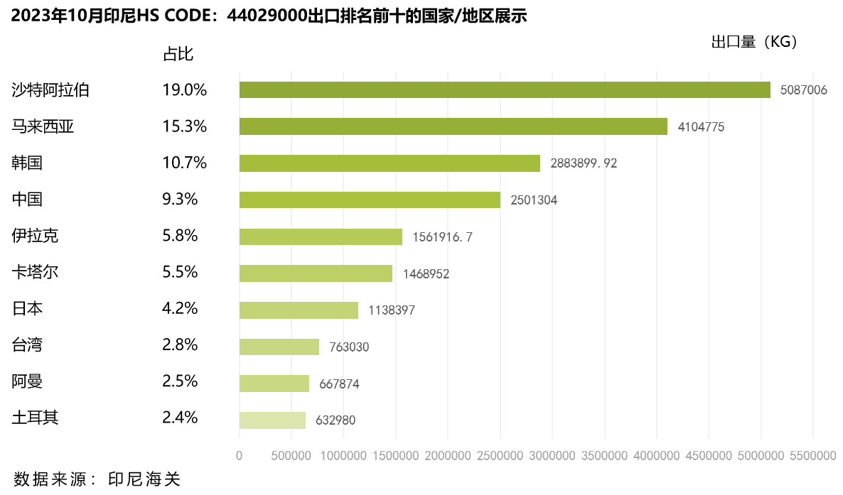 印尼海关最新数据显示,2023年10月竹、壳或坚果制炭(HS code:44029000)出口量为2.68万吨,同比降低16.6%,环比降低11.6%。其中,沙特阿拉伯的出口量最高,达到5087 吨;其次是马来西亚,出口量为4104.78吨;韩国的出口量排在第三位,达到2883.90 吨,到中国的出口量为2501.3吨,排名第四位。
