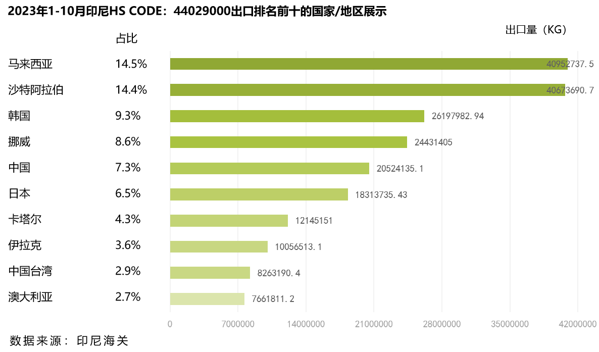 2023年 1-10月,印尼竹、壳或坚果制炭(HS code:44029000)出口最多的国家是马来西亚,出口量达到40952.74吨,到中国的出口量达到20524.14吨,排名第五位,平均每月到中国的出口量是2052.41吨。