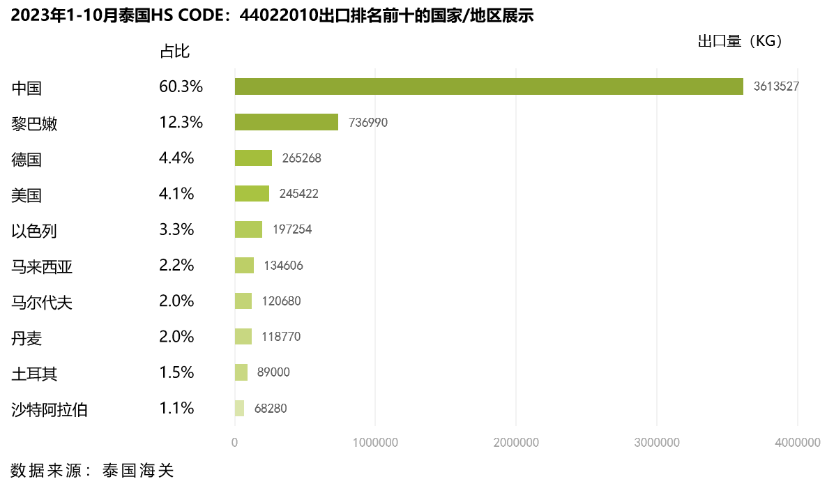 据泰国海关最新数据显示,2023年1-10月,壳炭、坚果炭,椰壳炭类产品(HS code: 44022010)出口量最多的国家是中国,出口量为3613.53吨,同往年同期降低33.7%,平均每月到中国的出口量是361.35吨。