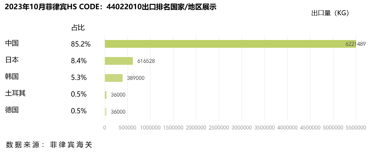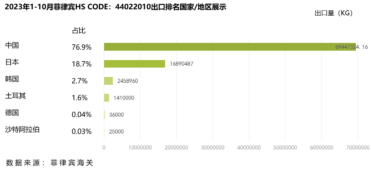 2023年1-11月,菲律宾壳炭、坚果炭,椰壳炭类产品(HS code:44022010)出口最多的国家是中国,出口量达到69447.32吨,平均每月出口 6313.39吨。
