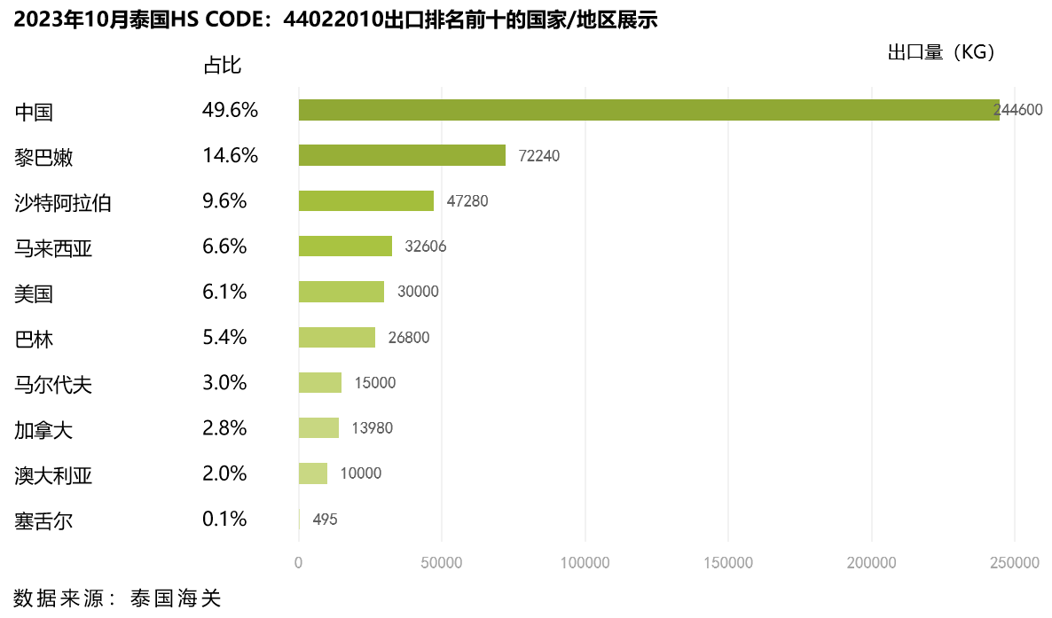 泰国海关最新数据显示,2023年10月壳炭、椰壳炭类产品(HS code:44022010)出口量为493.15吨,较上月增长64.7%。其中,到中国的出口量最高,达到244.6吨;其次是到黎巴嫩的出口量,达到72.24吨;到沙特阿拉伯的出口量排在第三位,达到47.28吨。