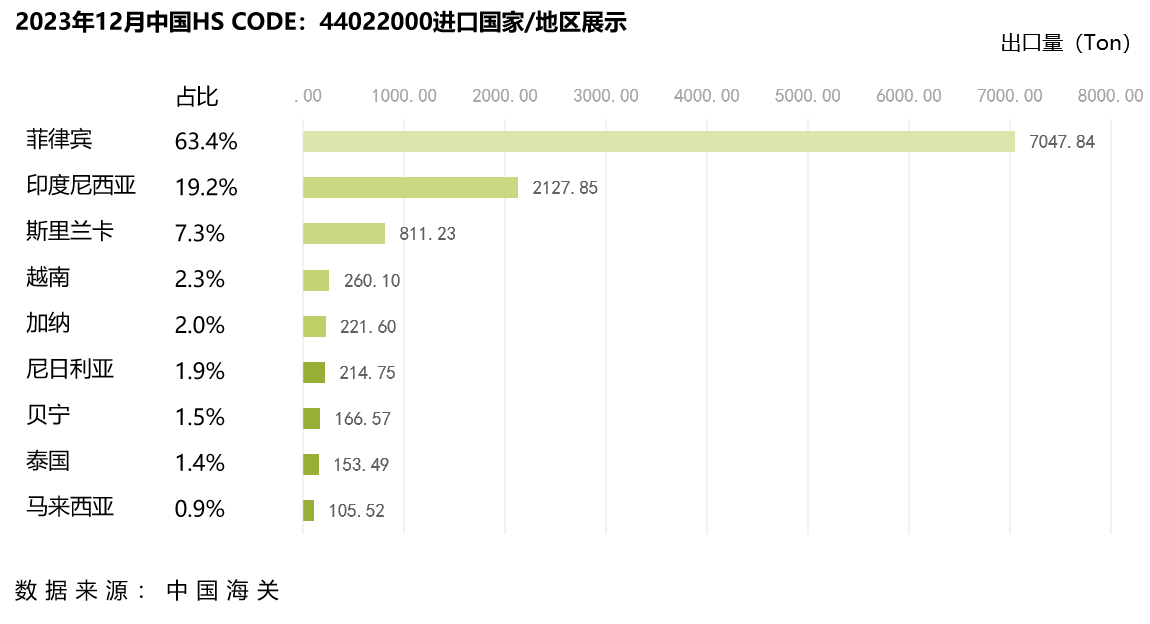 据菲律宾海关最新数据显示,2023 年12月壳炭、坚果炭,椰壳炭类产品(HS code:44022010)出口量为7889.31吨,同比增长35.5%,环比增长8.1%。其中,到中国的出口量为6221.49吨。