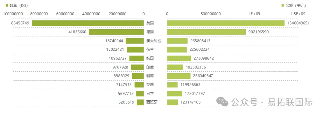 据中国海关最新数据显示,2024年9月锂离子蓄电池出口前十的贸易国如图所示,出口量排名第一的为美国8.55万吨,占月总量的30.5%,出口额13.46亿美元,平均单价15.75USD/KG,排名第二的为德国4.18万吨,占月总量的14.9%,出口额9.02亿美元,平均单价21.56USD/KG,排名第三的为澳大利亚1.37万吨,占月总量的4.9%,出口额2.36亿美元,平均单价17.16USD/KG。