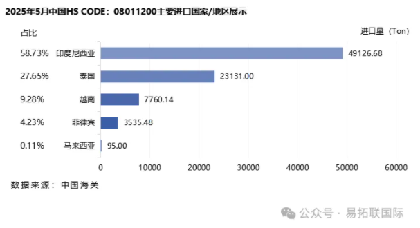 据中国海关最新数据显示,2025年5月椰子产品(HS code:08011200)进口量为8.36万吨,同比增长96.4%,环比增长11.5%。其中,印度尼西亚进口量最高,达到4.91万吨;其次是泰国的进口量,达到2.31万吨;越南的进口量排在第三位,达到7760.14吨。