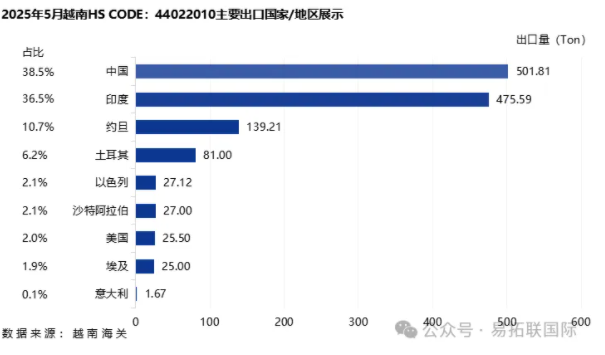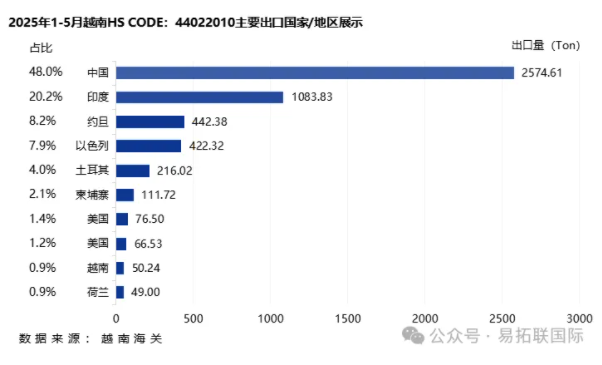 据越南海关最新数据显示,2025年1-5月果壳炭、坚果炭,椰壳炭类产品(HS code:44022010)出口量为5366.61吨。其中,到中国的出口量为2574.61吨。