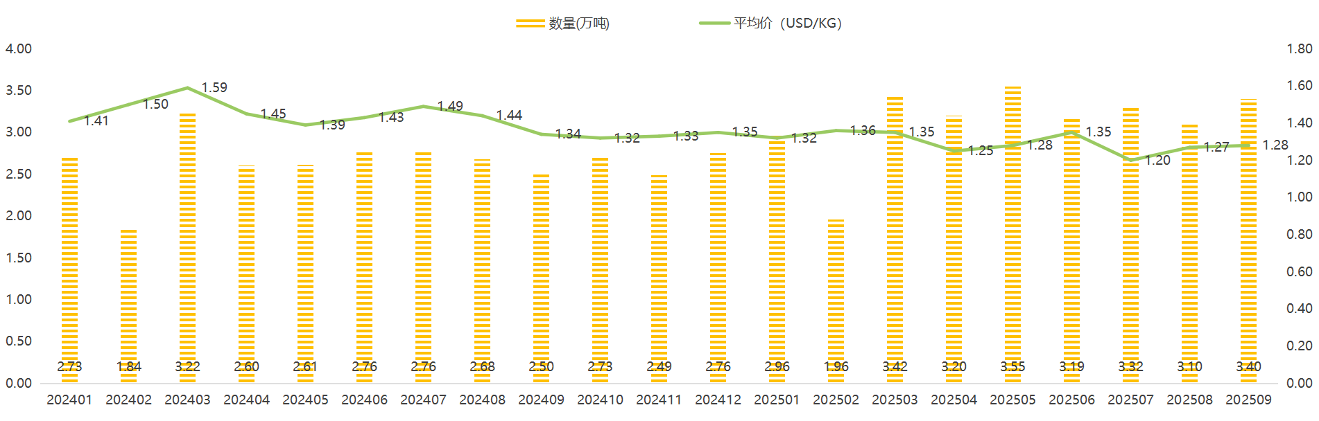 据最新中国海关数据显示,近年活性炭月度出口量及平均单价变化如下图所示,2025年9月活性炭出口量3.40万吨,同比增长35.7%,出口均价1.28USD/Kg,同比下降4.6%。1-9月出口量较往年同期增长18.5%。