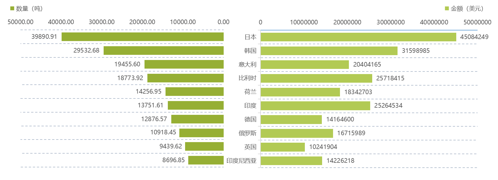 2025年1-9月活性炭出口主要贸易地如图所示,出口量排名第一的为日本,达到3.99万吨,占累计总量的14.2%,同比增长22.3%,出口额4508.42万美元,排名第二的为韩国,达到2.95万吨,占累计总量的10.5%,同比增长12.0%,出口额3159.90万美元,排名第三的为意大利,达到195万吨,占累计总量的6.9%,同比增长12.8%,出口额2040.42万美元。
