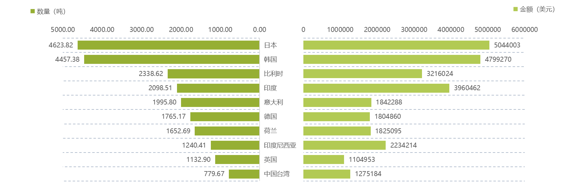 2025年9月,活性炭主要出口贸易地如图所示,出口量排名第一的为日本,达到4623.82吨,占当月总量的13.6%,出口额为504.40万美元,排名第二的为韩国,达到4457.38吨,占当月总量的13.1%,出口额为479.93万美元,排名第三的为比利时,达到2338.62吨,占当月总量的6.9%,出口额321.60万美元。