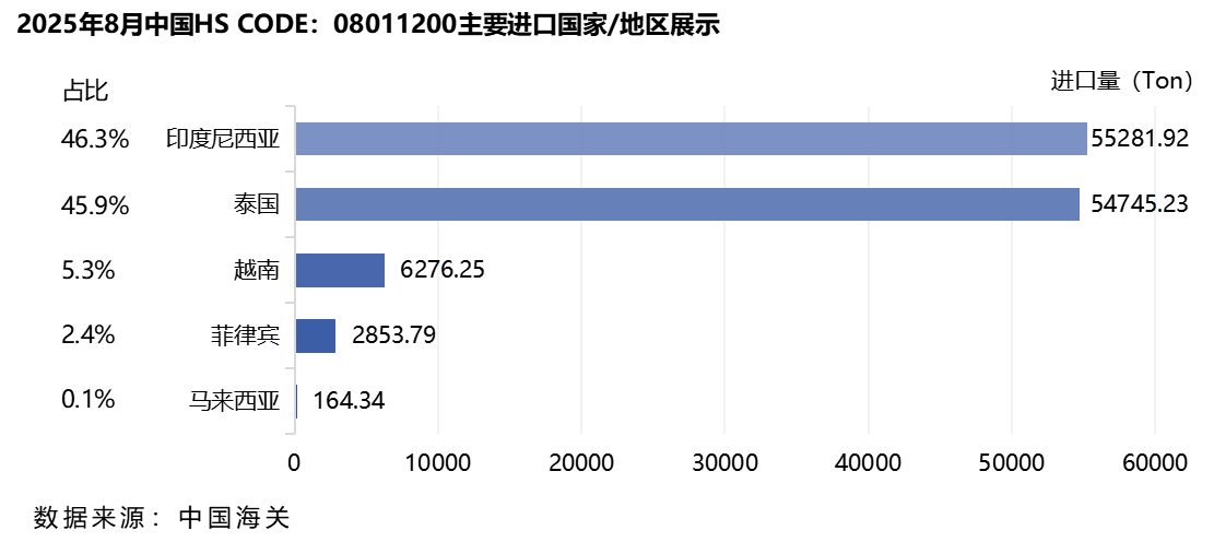 据最新数据显示,2025年8月椰子产品(HS code:08011200)进口量为11.94万吨,同比增长41.8%,环比增长5.8%。其中,印度尼西亚进口量最高,达到5.53万吨;其次是泰国的进口量,达到5.47万吨;越南的进口量排在第三位,达到6276.25吨。
